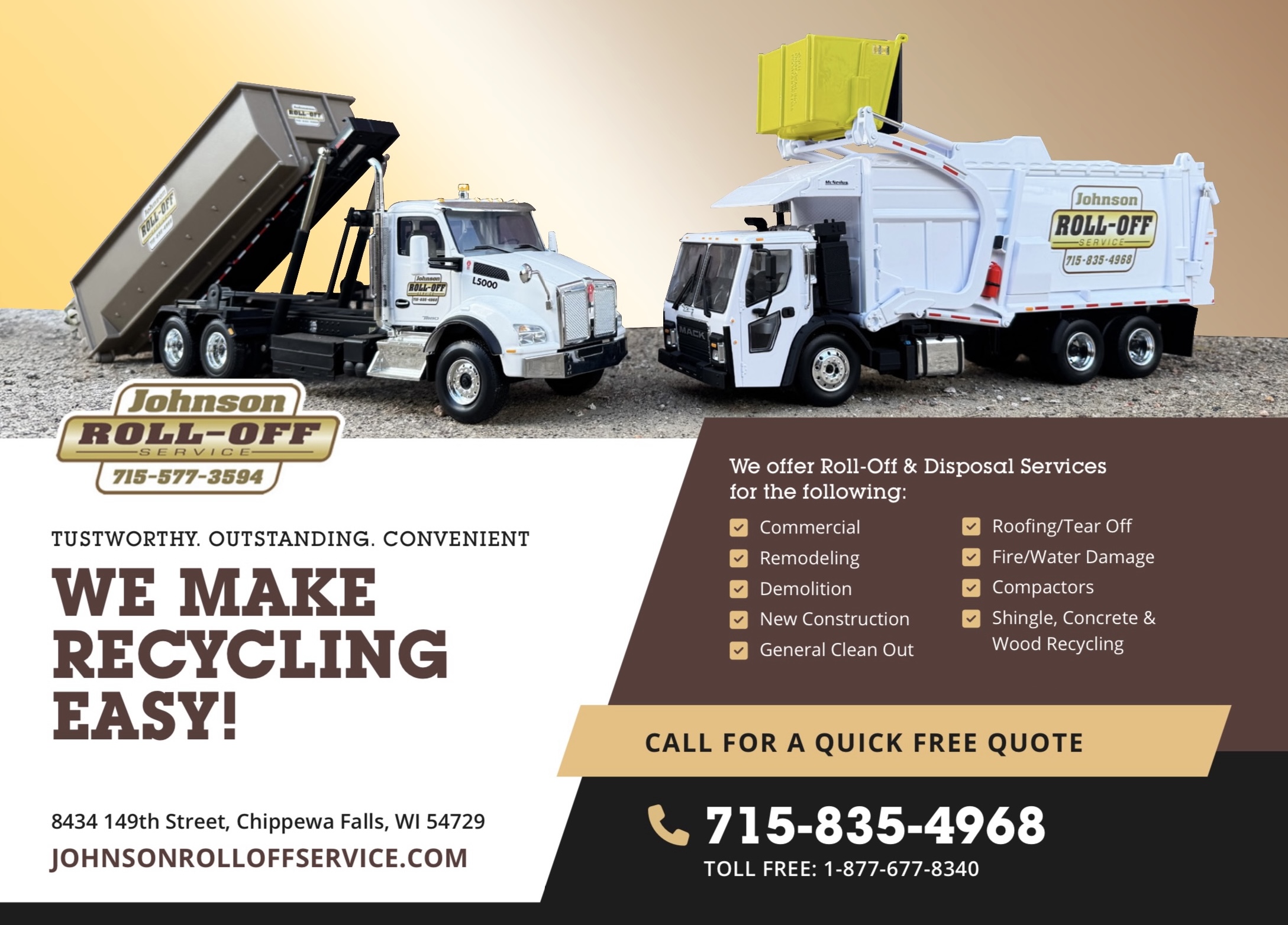 Toll Free: 877-677-8340Johnson Roll-Off Service is a local roll-off dumpster company owned and operated by Brian Johnson in Eau Claire, WI. We proudly serve the majority of West Central Wisconsin with over 20 years in the recycling business. You can be assured of prompt, courteous and professional service. We provide dumpsters for recycling metal, appliances, electronics, tires, roofing shingles and much more. We provide dumpster and roll-off services to a wide variety of customers from residential projects to industrial and commercial companies.
